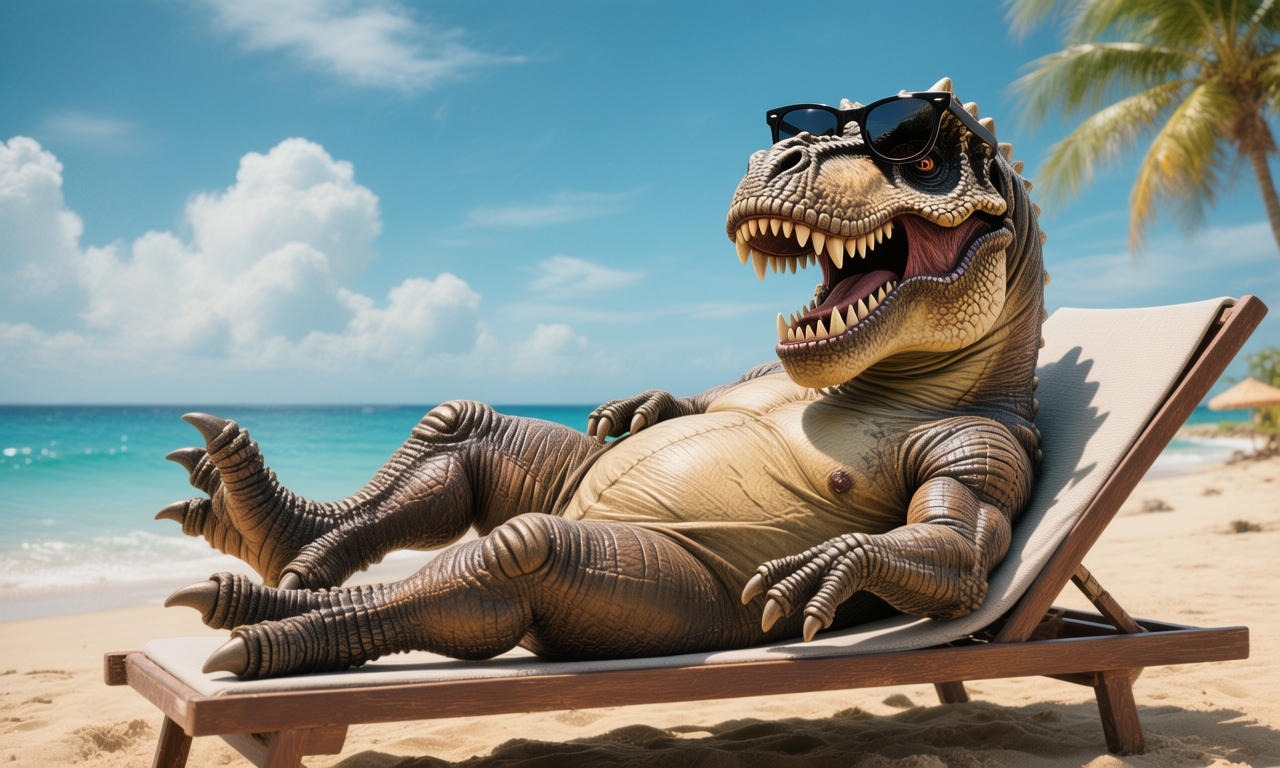 "prompt": "A T-Rex relaxing on a beach, lying on a sun lounger and wearing sunglasses.",